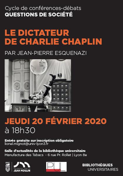 Dans le cadre du cycle de conférences-débats "Questions de société", Jean-Pierre Esquenazi (Lyon 3) vient communiquer à l'occasion de la parution de l'ouvrage "Le Dictateur de Charlie Chaplin" aux Presses universitaires de Lyon.