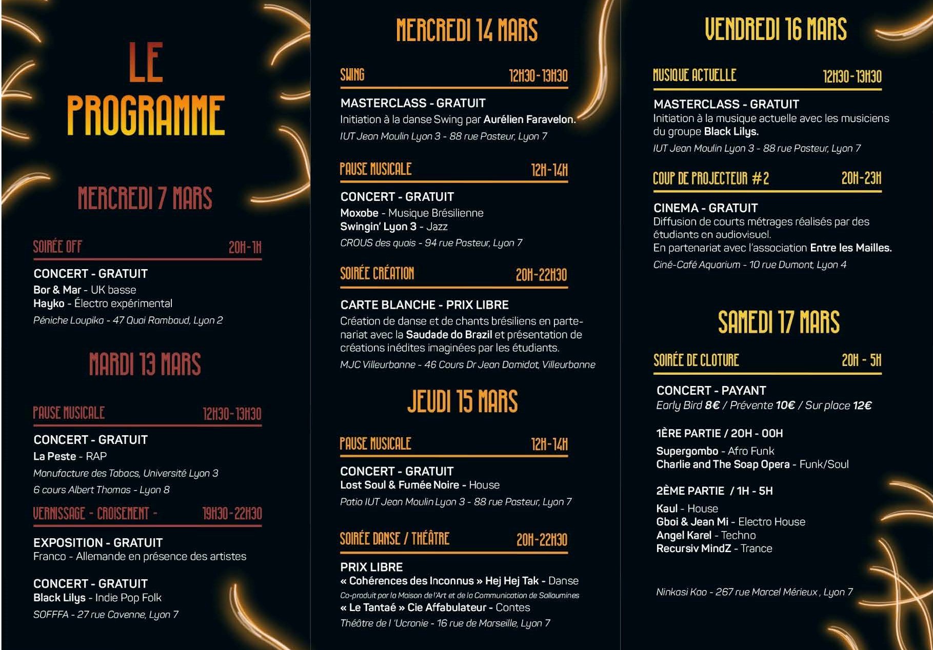 Organisé par et pour des étudiants, ce festival d’art pluridisciplinaire propose chaque année un programme de qualité, riche et varié. Son objectif ? Mettre en avant les talents artistiques des étudiants aux côtés de ceux d’artistes professionnels.