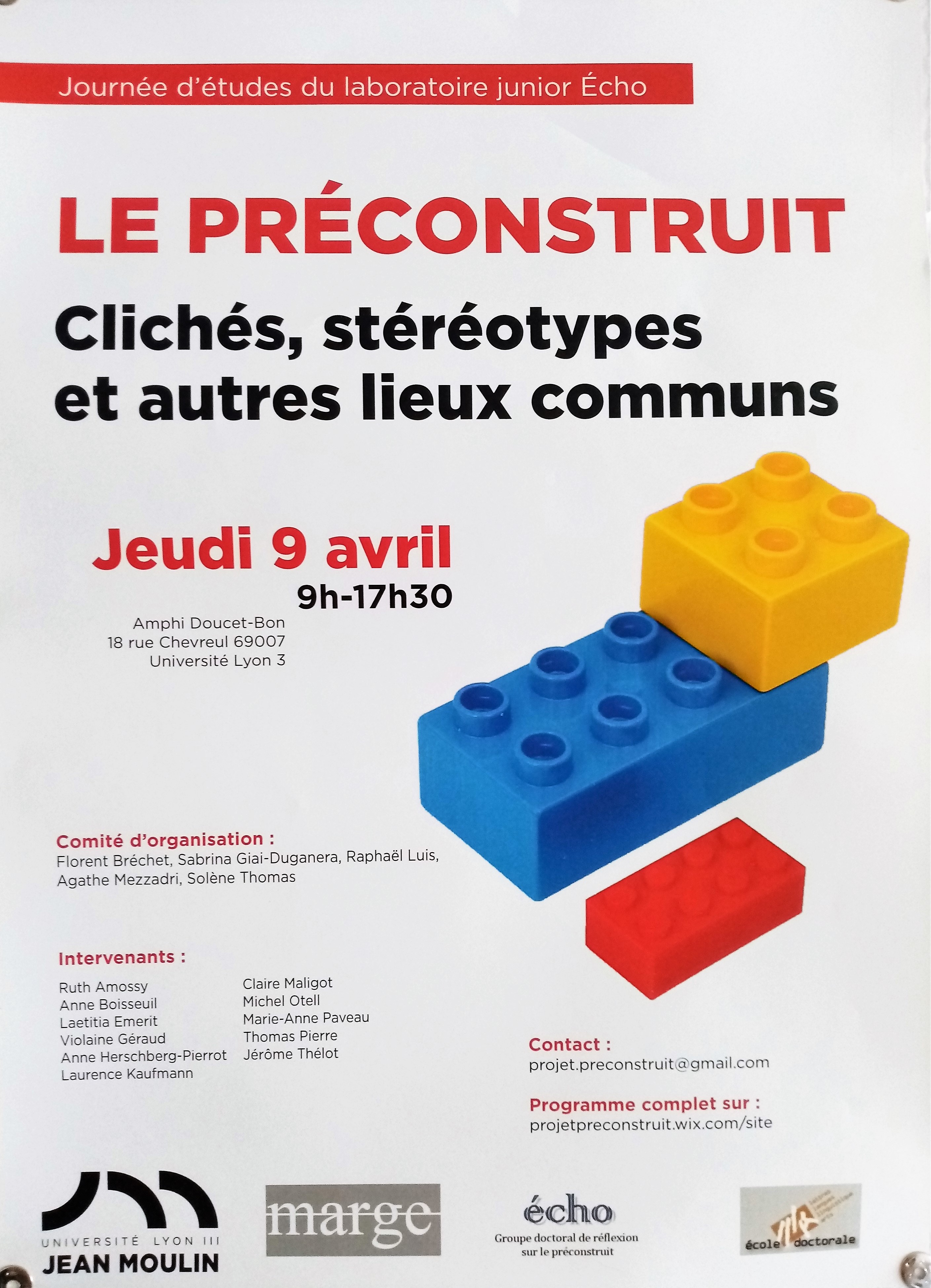 Le projet consiste en l’élaboration d’un ouvrage théorique de référence sur le « préconstruit », ses fondements, ses formes et ses fonctions, édité dans la collection « Rencontres » des Classiques Garnier. En amont, une journée d’étude consacrée à la question se déroulera le jeudi 9 avril 2015 à l’Université Lyon 3 afin de préparer cet événement.