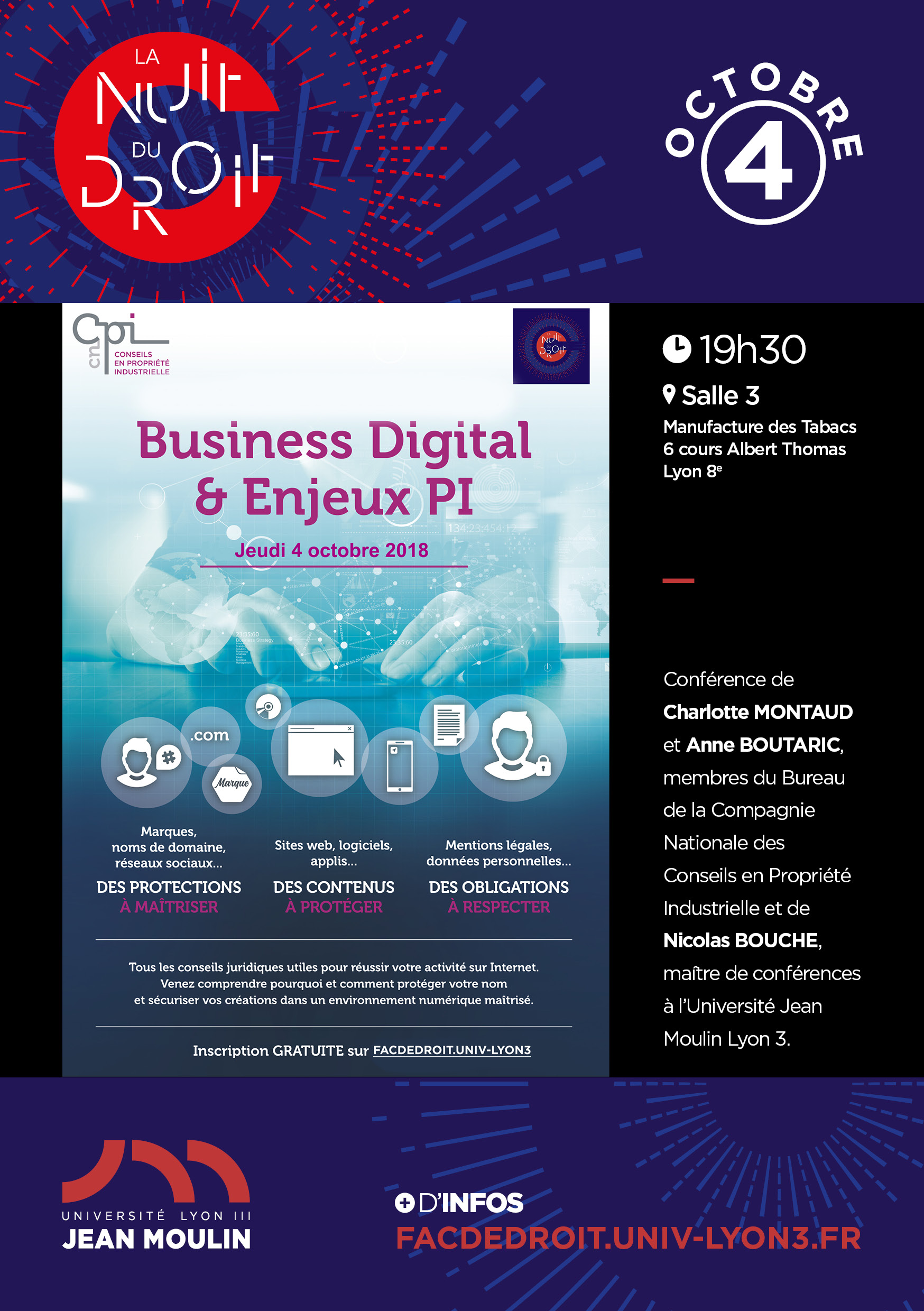Business digital et Enjeux PIConférence de Charlotte MONTAUD et Anne BOUTARIC, membres du Bureau de la Compagnie Nationale des Conseils en Propriété Industrielle et de Nicolas BOUCHE, maître de conférences à l’Université Jean Moulin Lyon 3.