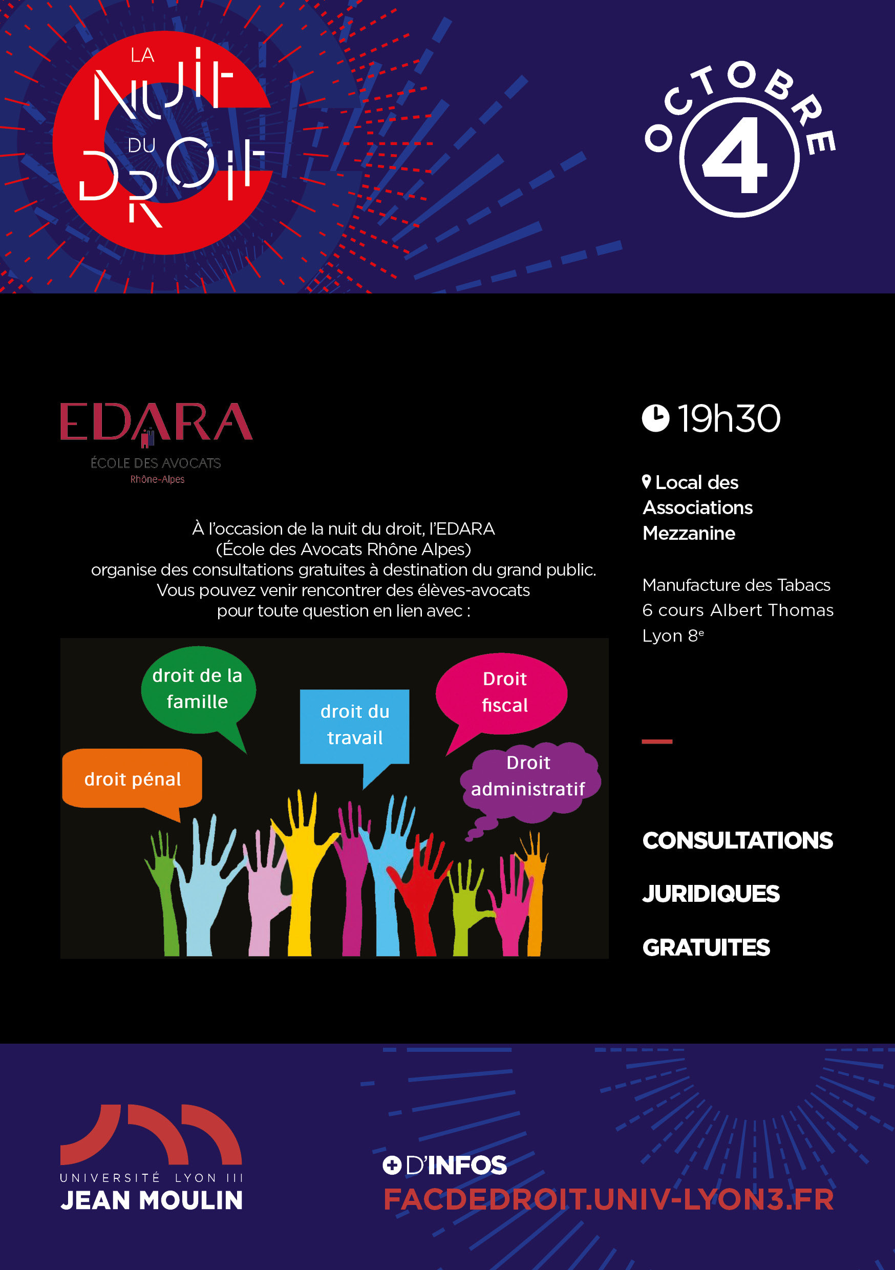 Le 4 octobre 2018, la Faculté de droit se fera « maison du droit » et accueillera à la Manufacture des Tabacs la 1ère édition lyonnaise de la « Nuit du Droit » qui regroupera notamment, aux côtés de la Faculté, le Barreau de Lyon, et celui de l'Ain, la Chambre des notaires du Rhône, la Cour d’appel de Lyon, la Cour administrative d’appel de Lyon, le Conseil régional des notaires de Lyon, l’École des avocats Rhône-Alpes, la Chaire lyonnaise des droits de l’Homme, la Compagnie Nationale des Conseils en Propriété Industrielle, ainsi que le Centre de formation professionnelle des notaires et l’Institut des métiers du notariat.