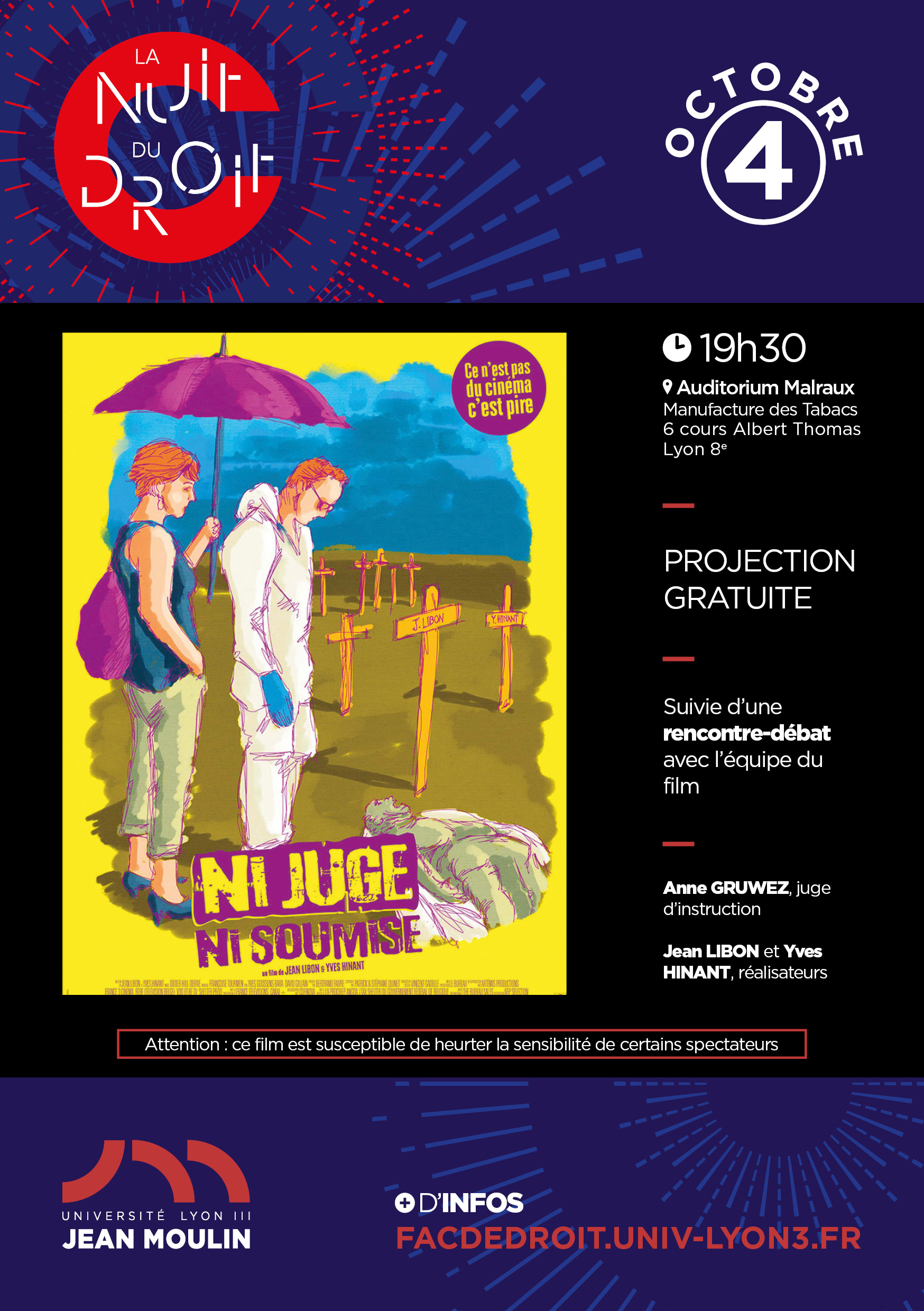 Documentaire « Ni juge ni soumise »Diffusion du documentaire suivie d’un débat en présence de Anne GRUWEZ, juge d’instruction à Bruxelles, de Jean LIBON et Yves HINANT, réalisateurs, de Jean DANET, membre du Conseil supérieur de la magistrature, de Gaël CANDELA, juge d’instruction à Bourg-en-Bresse et de Marc BONINCHI, maître de conférence à l’Université Jean Moulin Lyon 3.