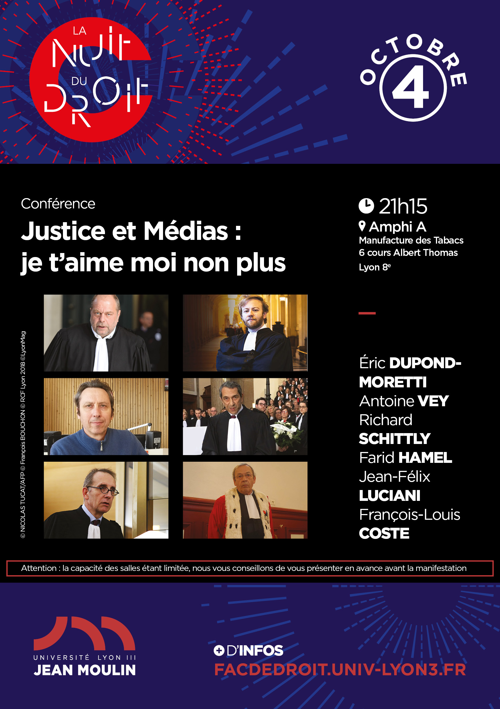 Justice et médias : je t’aime moi non plusConférence de Éric DUPOND-MORETTI et Antoine VEY, avocats associés, cabinet Dupont-Morreti & Vey, de Richard SCHITTLY, chroniqueur judiciaire, de Farid HAMEL, bâtonnier de Lyon, de Jean-Félix LUCIANI, avocat et de François-Louis COSTE, ancien avocat général près la Cour d’appel de Paris.