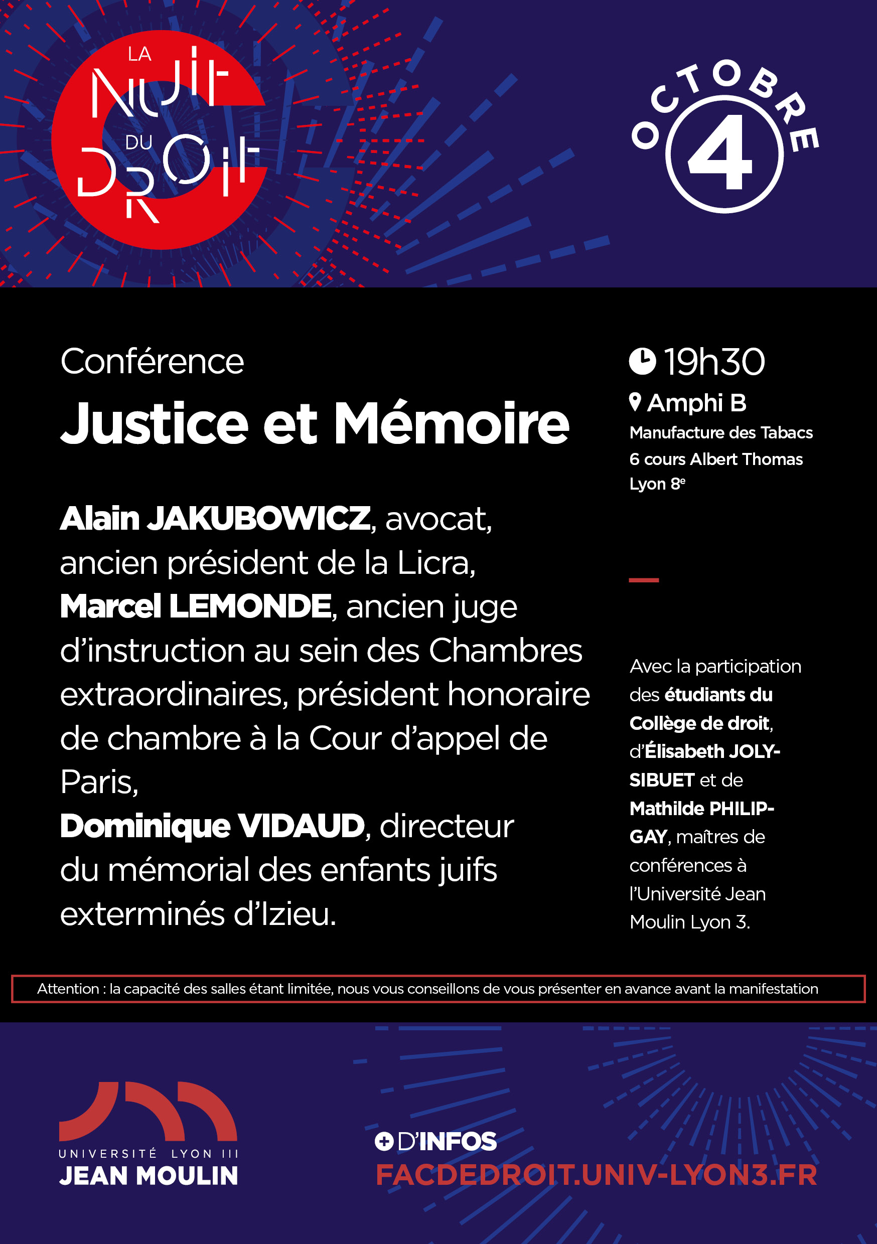 Justice et MémoireConférence de Marcel LEMONDE, ancien juge d’instruction au sein des Chambres extraordinaires, président honoraire de chambre à la Cour d’appel de Paris, de Alain JAKUBOWICZ, avocat, ancien président de la Licra et de Dominique VIDAUD, directeur du mémorial des enfants juifs exterminés d’Izieu. Avec la participation des étudiants du Collège de droit, d’Élisabeth JOLY-SIBUET et de Mathilde PHILIP-GAY, maîtres de conférences à l’Université Jean Moulin Lyon 3.
