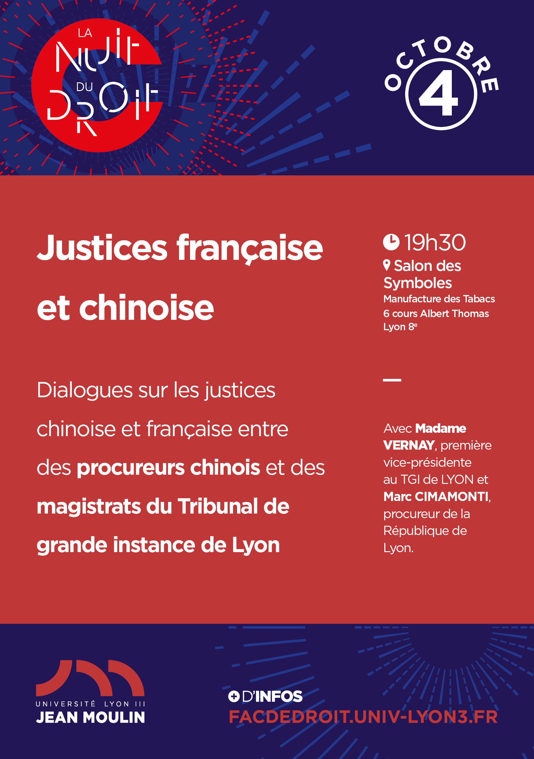 Justices française et chinoiseDialogues sur les justices chinoise et française entre des procureurs chinois et des magistrats du Tribunal de grande instance de Lyon. Avec Madame VERNAY, première vice-présidente au TGI de Lyon et Marc CIMAMONTI, procureur de la République de Lyon.