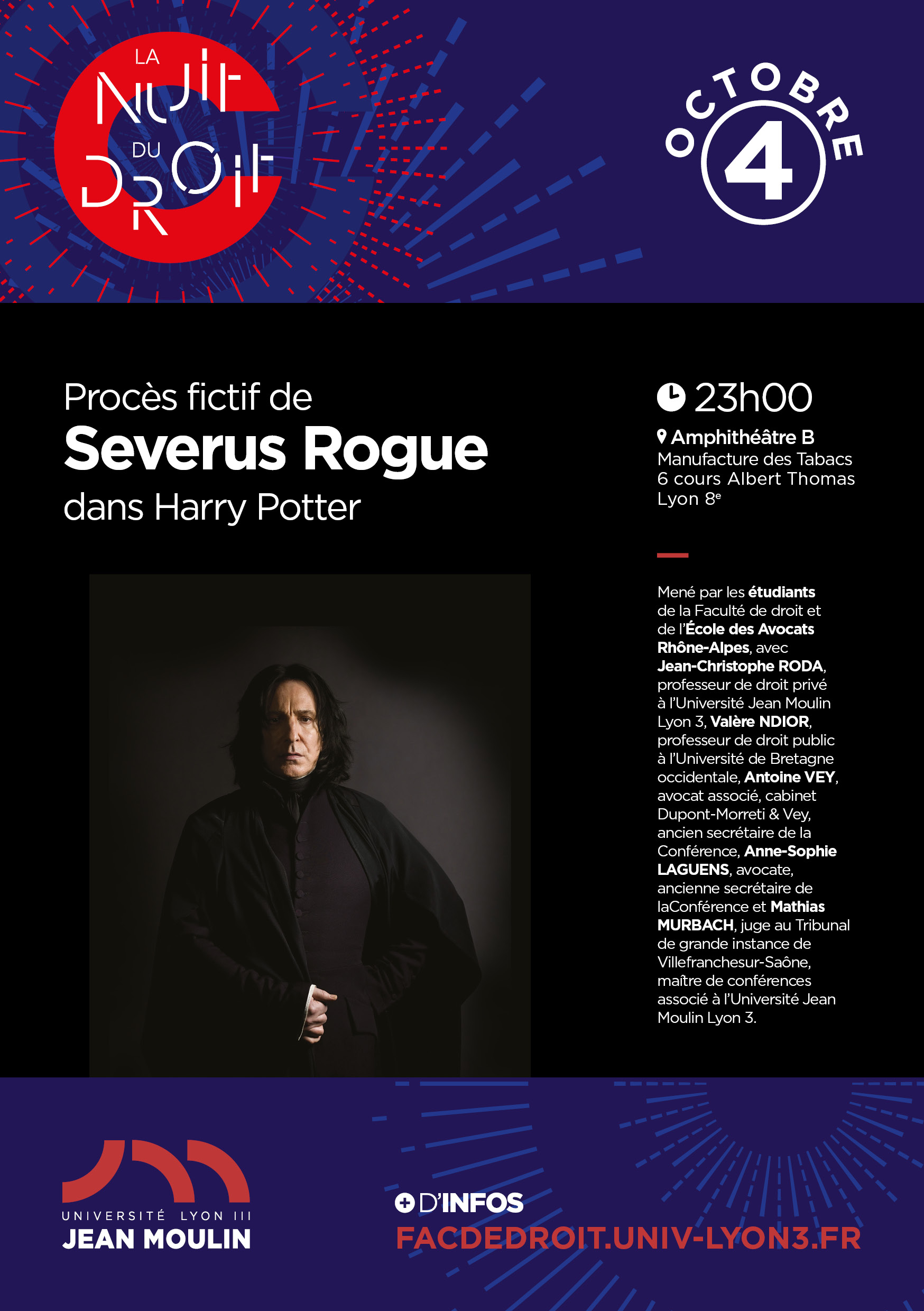Severus Rogue dans Harry PotterMené par les étudiants de la Faculté de droit et de l’école des avocats Rhône-Alpes, avec Jean-Christophe RODA, professeur de droit privé à l’Université Jean Moulin Lyon 3, Valère NDIOR, professeur de droit public à l’Université de Bretagne occidentale, Antoine VEY, avocat associé, cabinet Dupont-Morreti & Vey, ancien secrétaire de la Conférence, Anne-Sophie LAGUENS, avocate, ancienne secrétaire de la Conférence et Mathias MURBACH, juge au Tribunal de grande instance de Villefranche-sur-Saône, maître de conférences associé à l’Université Jean Moulin Lyon 3.