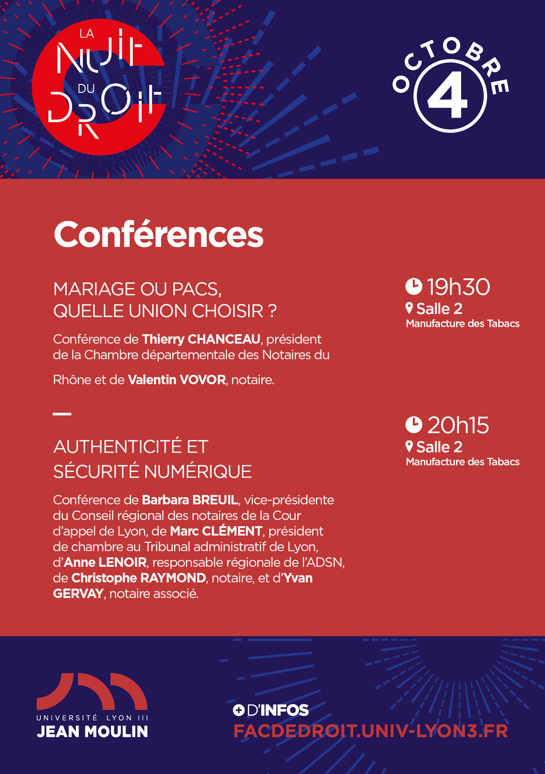 Authenticité et Sécurité numériqueConférence de Barbara BREUIL, vice-présidente du Conseil régional des notaires de la Cour d’appel de Lyon, de Marc CLÉMENT, président de chambre au Tribunal administratif de Lyon, d’Anne LENOIR, responsable régionale de l’ADSN, de Christophe RAYMOND, notaire, et d’Yvan GERVAY, notaire associé.