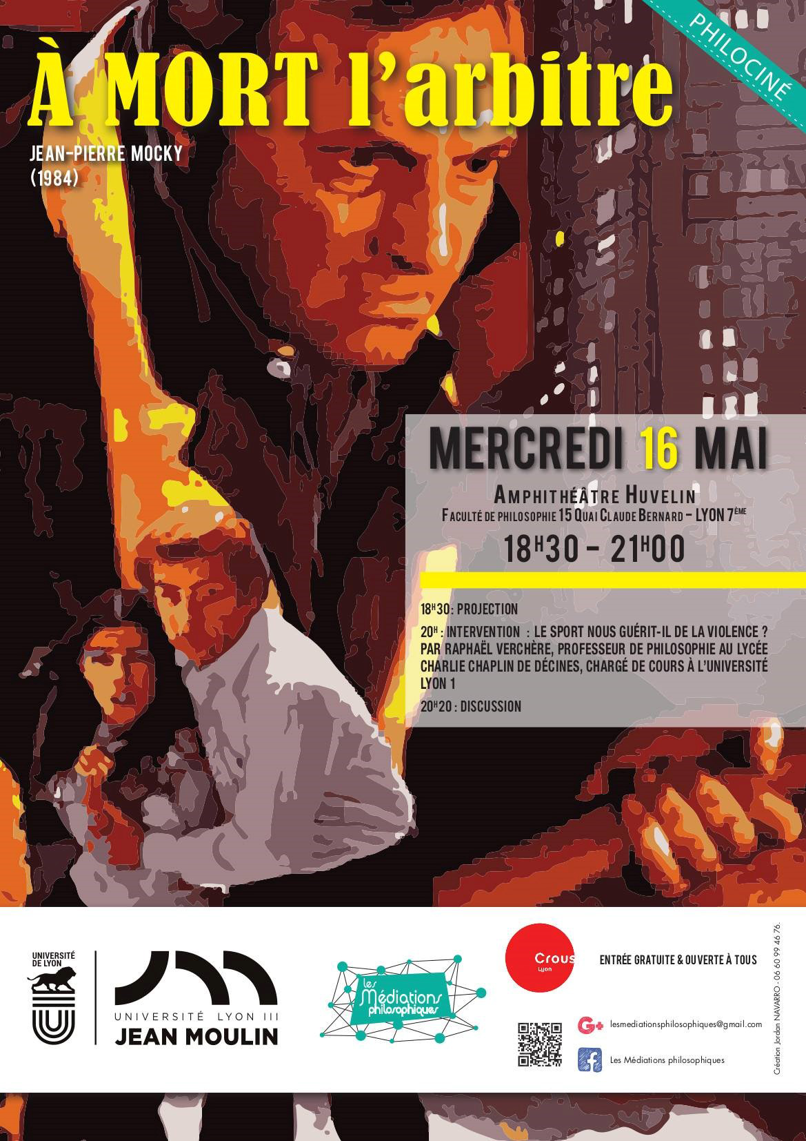- 21h : Intervention de Raphaël Verchère, Professeur de Philosophie au lycée et chargé de cours à l'Université Lyon 1, sur "Le sport nous guérit-il de la violence ?"