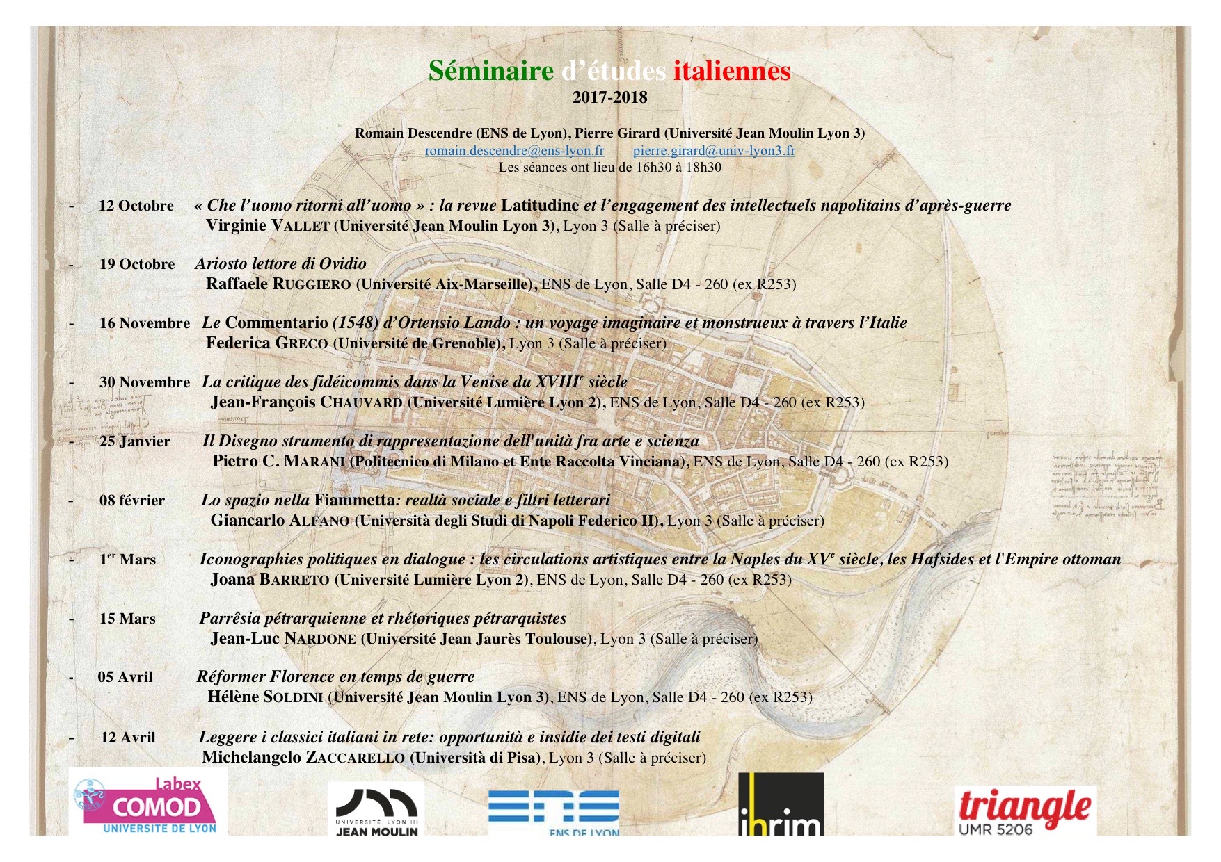 Le séminaire d’études italiennes organisé conjointement par deux laboratoires pluridisciplinaires, le laboratoire Triangle (UMR5206) et le CERPHI (IHRIM-UMR5317), aura lieu de octobre 2017 à avril 2018.